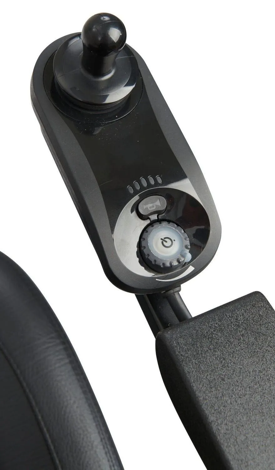 Additional features include a side-mounted charging port for easy access, an adjustable-depth swivel seat, and adjustable armrests for personalized comfort. The new and improved design also includes nylon drive wheels for reduced weight and a modern look, oil-embedded bearings for increased durability, and a larger footplate for added comfort.
