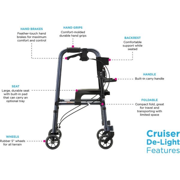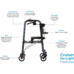- FEATURES: The Cruiser De-Light is a hybrid walker that combines the structure of a folding walker with the benefits of a 4-wheeled walker with locking hand brakes and seat. The beautiful metallic paint finish is attractive and long lasting