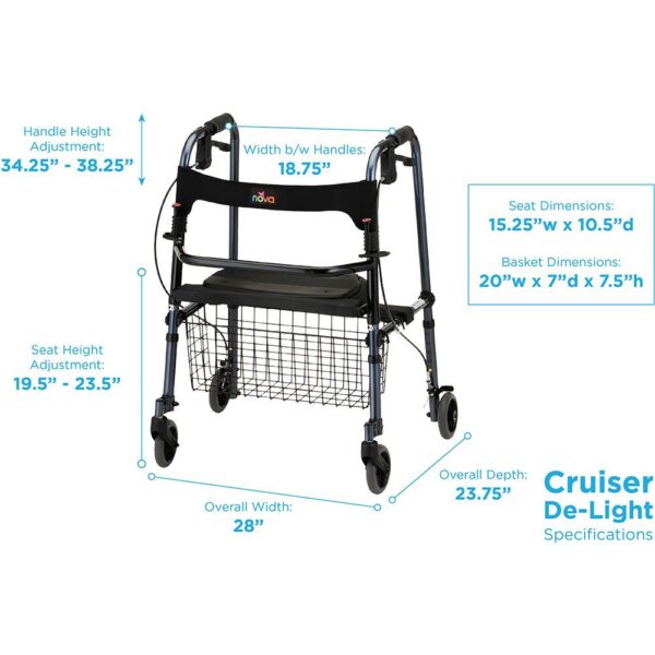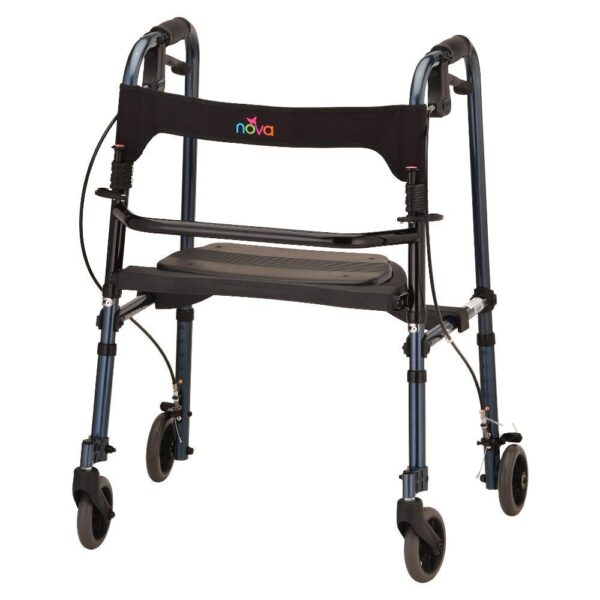 The NOVA Cruiser De-Light Rolling Walker (4010BL) is a real pleasure! It is the only 4-wheeled rolling walker that folds and has adjustable legs like a standard folding walker. Additionally, it has the added benefits of locking hand brakes and a seat that comes up so the user can walk inside the frame to reach counters or shelves. ACCESSORY OPTIONS: Cup Holder (CH-1000/ CH-3000R) Flashlight Attachment Cane Holder (CH-4000R) Designer Mobility Bags Basket (Item #4010B) Tray