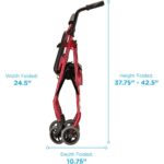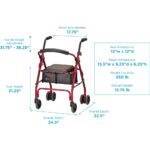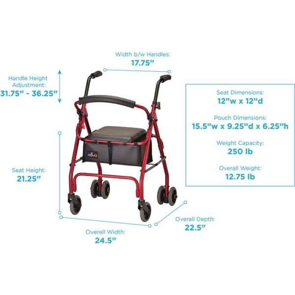 • SPECIFICATIONS: Approximate user height of 5’3″ – 6’0″; Seat height is 21.25″; Weight Capacity is 250 lb.; Walker weight is 12 lb.; Handle height adjustable from 31.5″-35.25″; Width between handles: 17.5″; Overall dimensions: 24.5″W x 22.5”D