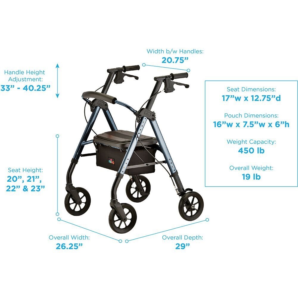 - SO EASY TO FOLD and GO! Great for storage and travel. Comes with a convenient handle bar to easily fold the walker and NOVA’s patent pending LOCK & LIFT pin to keep the walker in a folded position, making it much easier to lift in and out of a car or storage. Watch the video to show this feature.