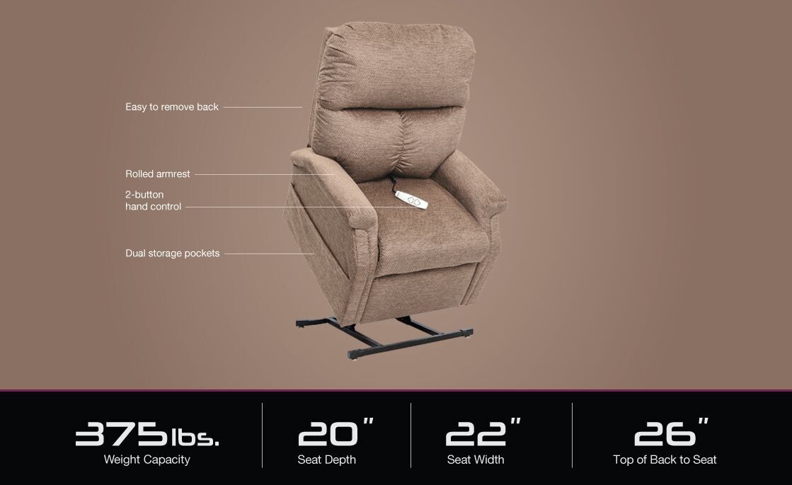 A roomy 22-inch seat and 375-pound weight capacity can accommodate a variety of users. Beyond providing unmatched support and comfort, the LC-250 lift chair puts the power in your hands with an easy-to-use, two-button control that allows you to move effortlessly through full recline, seated, and standing positions.