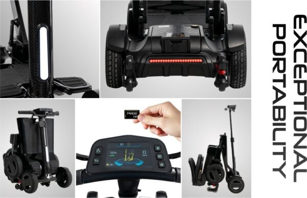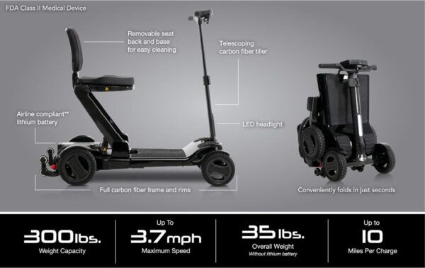 Harnessing the power of its full carbon fiber frame, the Go Go® Carbon offers exceptional portability in a four-wheel scooter. It weighs just 35 pounds without its (lithium) battery, folds down in seconds for convenient transport and storage, and can be towed like luggage through airports and other environments.
