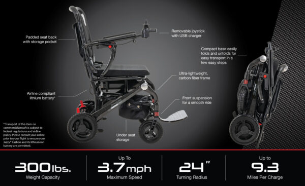 Weighing in at a stunning 39 pounds without the battery, Jazzy Carbon still provides top speeds up to 3.7 mph with a weight capacity of 300 pounds.