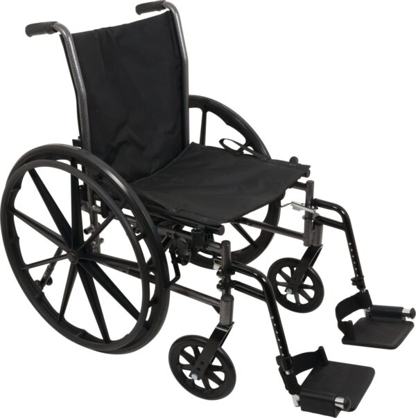 - Includes tool-free swing-away footrests with heel loops or elevating legrests with composite footplates