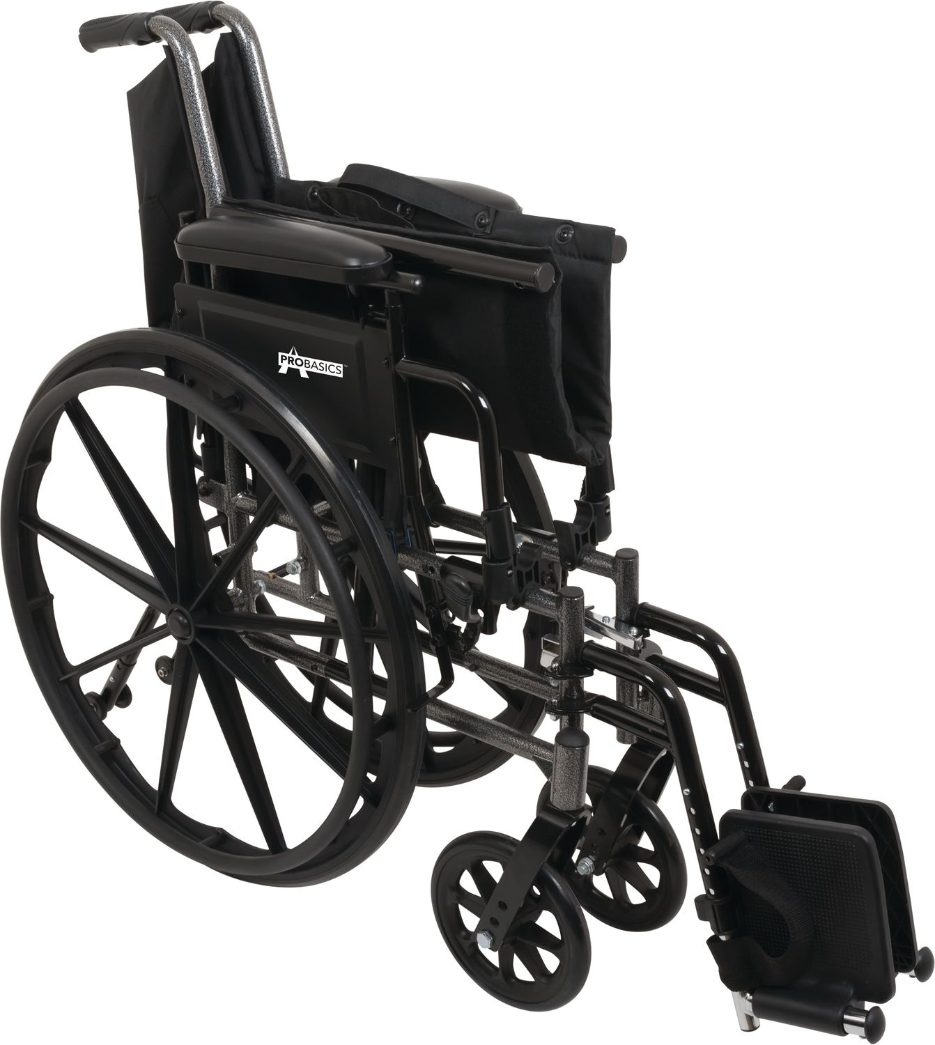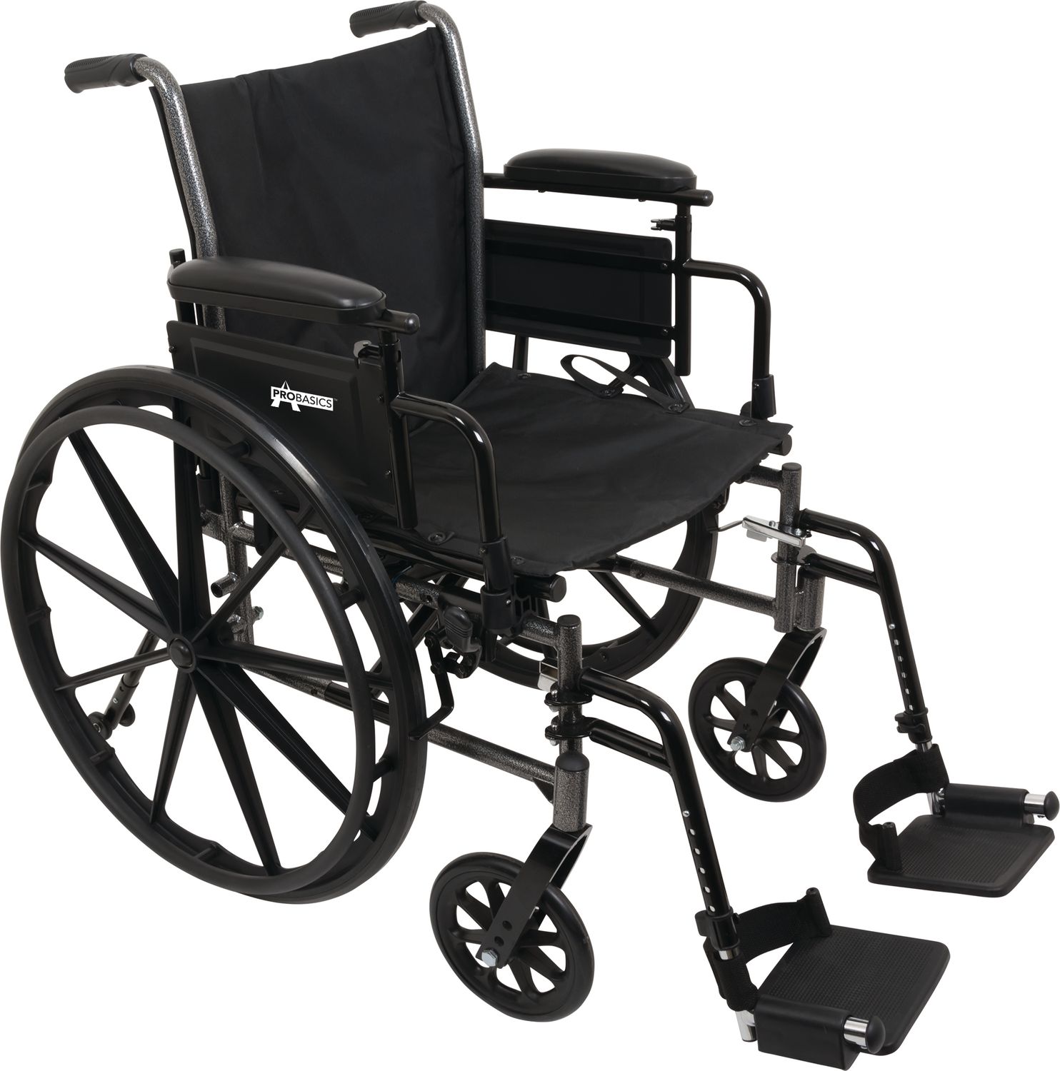 The ProBasics Lightweight Wheelchair offers all the benefits of a standard K3 wheelchair with the added feature of removable flip back height adjustable arms and 2-inch upholstery seat extension. Weighing less than 36 pounds, the ProBasics K3 also comes standard with tool-free adjustable front riggings and easy push-lock wheel locks.