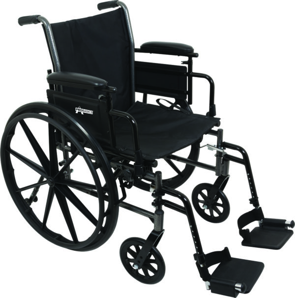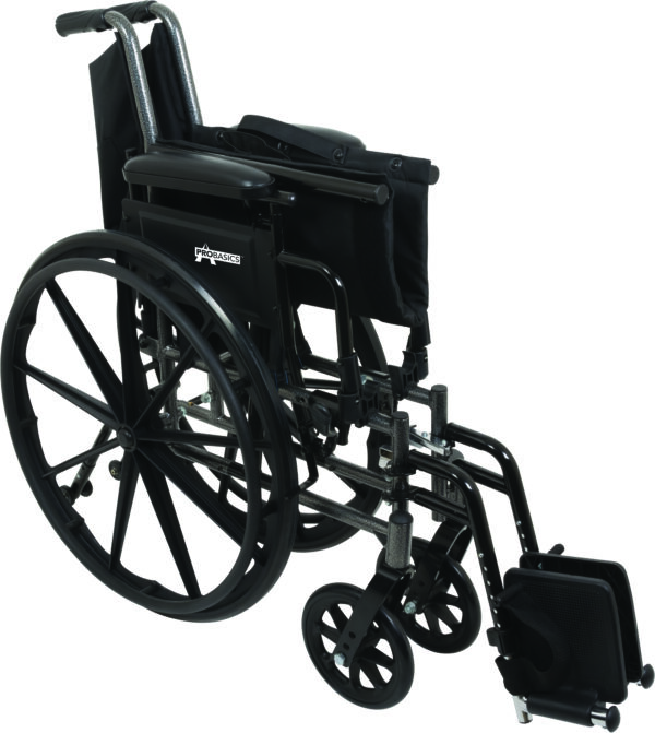 The ProBasics Lightweight Wheelchair offers all the benefits of a standard K3 wheelchair with the added feature of removable flip back height adjustable arms and 2-inch upholstery seat extension. Weighing less than 36 pounds, the ProBasics also comes standard with tool-free adjustable front riggings and easy push-lock wheel locks.